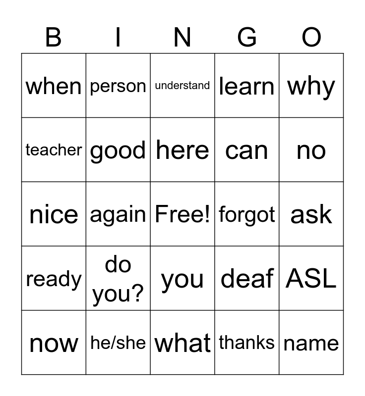 This bingo card has a free space and 29 words: now, fun, again, who, when, understand, good, do you?, forgot, he/she, ask, name, what, thanks, no, me/I, you, ready, why, nice, deaf, heard of hearing, can, teacher, learn, person, ASL, here and like.