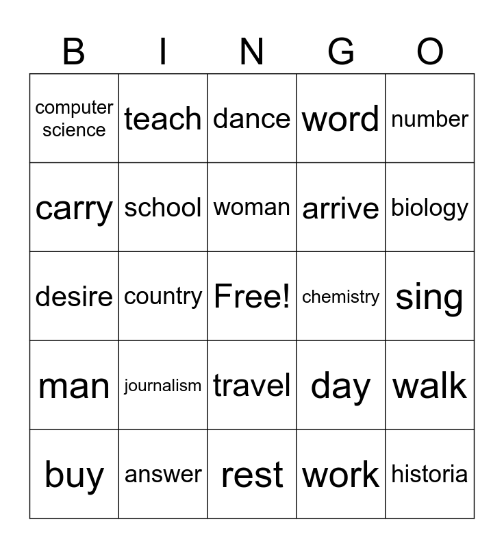 This bingo card has a free space and 36 words: the driver, thing, notebook, school, day, man, woman, hand, number, name, country, word, passenger, chemistry, biology, computer science, foreign languages, journalism, historia, dance, sing, walk, answer, buy, rest, teach, desire, listen, arrive, carry, return, end, work, travel, week and hoy.