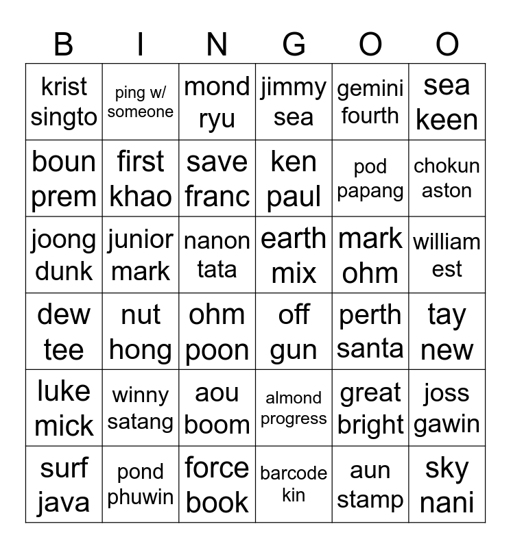 This bingo card has 36 words: almond progress, aou boom, barcode kin, boun prem, dew tee, earth mix, first khao, force book, gemini fourth, great bright, chokun aston, jimmy sea, joss gawin, junior mark, ken paul, krist singto, luke mick, mark ohm, joong dunk, mond ryu, nanon tata, nut hong, off gun, ohm poon, perth santa, ping w/ someone, pod papang, pond phuwin, save franc, sea keen, sky nani, surf java, tay new, william est, winny satang and aun stamp.
