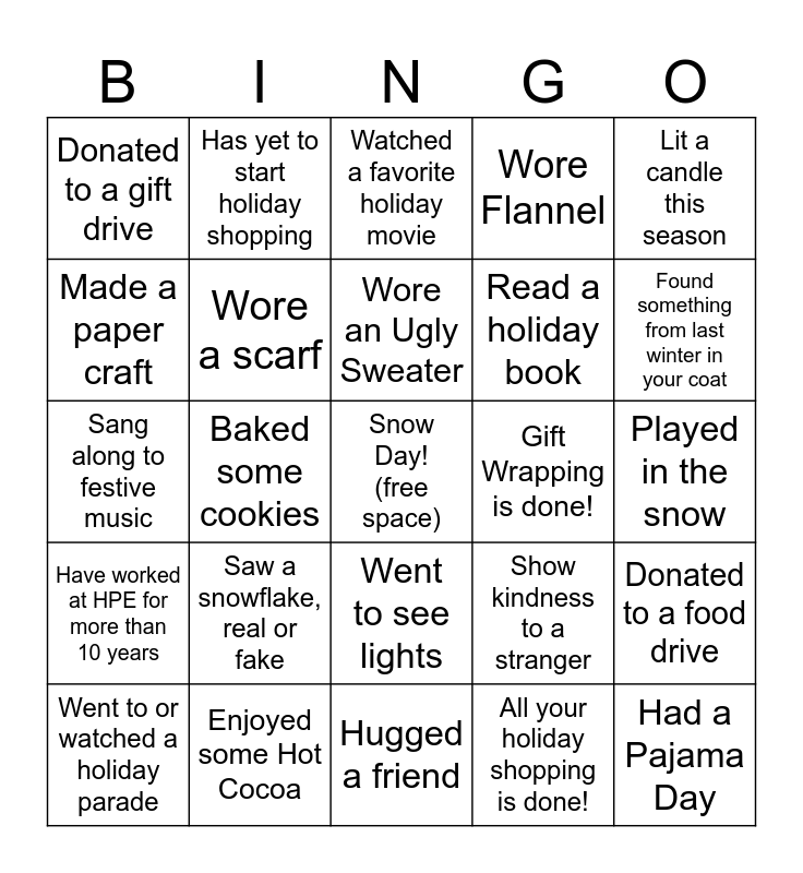 This bingo card has a free space and 24 words: Saw a snowflake, real or fake, Enjoyed some Hot Cocoa, Wore an Ugly Sweater, Went to or watched a holiday parade, Lit a candle this season, Donated to a gift drive, Made a paper craft, Has yet to start holiday shopping, Gift Wrapping is done!, Went to see lights, Read a holiday book, Sang along to festive music, Show kindness to a stranger, Donated to a food drive, Wore a scarf, All your holiday shopping is done!, Played in the snow, Watched a favorite holiday movie, Found something from last winter in your coat, Baked some cookies, Had a Pajama Day, Have worked at HPE for more than 10 years, Wore Flannel and Hugged a friend.