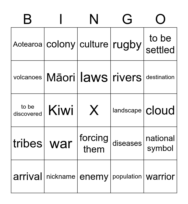 This bingo card has a free space and 34 words: North Island, population, capital, trade, tribes, Māori, to be settled, arrival, colony, rights, laws, culture, haka, ritual, landscape, destination, nickname, to be discovered, war, diseases, forcing them, government, Aotearoa, cloud, enemy, warrior, rugby, mountains, rivers, volcanoes, beaches, Kiwi, national symbol and location.
