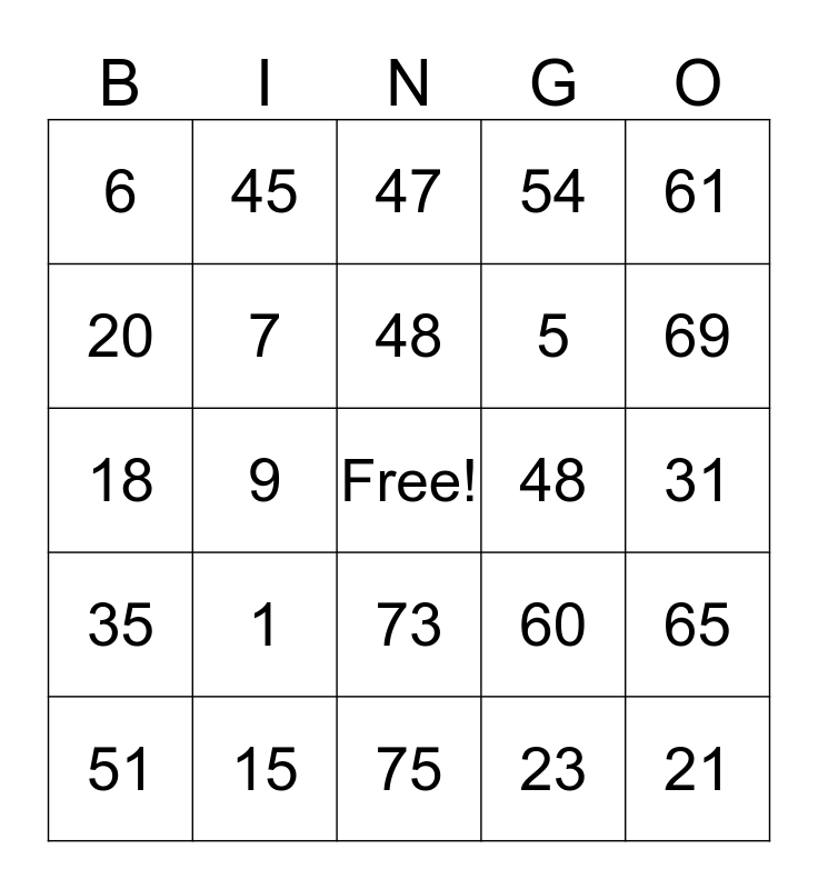 This bingo card has a free space and 24 words: 1, 15, 48, 51, 61, 6, 20, 45, 48, 73, 5, 18, 60, 65, 7, 23, 31, 47, 69, 9, 21, 35, 54 and 75.