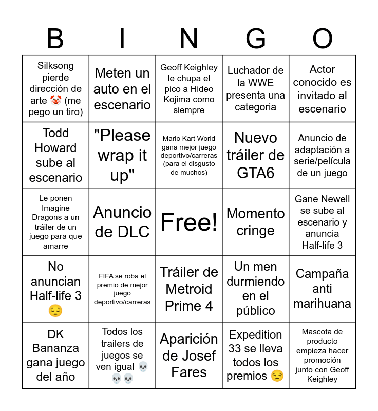 This bingo card has a free space and 24 words: DK Bananza gana juego del a帽o, FIFA se roba el premio de mejor juego deportivo/carreras, Mario Kart World gana mejor juego deportivo/carreras (para el disgusto de muchos), Expedition 33 se lleva todos los premios 馃槖, Actor conocido es invitado al escenario, Silksong pierde direcci贸n de arte 馃ぁ (me pego un tiro), Meten un auto en el escenario, Geoff Keighley le chupa el pico a Hideo Kojima como siempre, Momento cringe, Gane Newell se sube al escenario y anuncia Half-life 3, Le ponen Imagine Dragons a un tr谩iler de un juego para que amarre, "Please wrap it up", Un men durmiendo en el p煤blico, Campa帽a anti marihuana, Todd Howard sube al escenario, Todos los trailers de juegos se ven igual 馃拃馃拃馃拃, Aparici贸n de Josef Fares, Luchador de la WWE presenta una categoria, Anuncio de adaptaci贸n a serie/pel铆cula de un juego, No anuncian Half-life 3 馃様, Anuncio de DLC, Tr谩iler de Metroid Prime 4, Nuevo tr谩iler de GTA6 and Mascota de producto empieza hacer promoci贸n junto con Geoff Keighley.