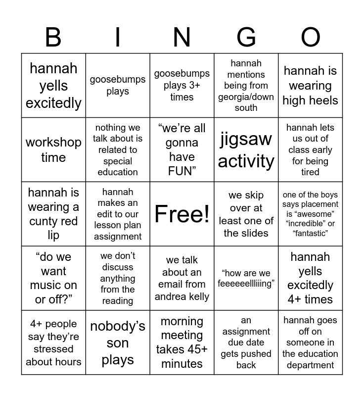 This bingo card has a free space and 24 words: we don’t discuss anything from the reading, nobody’s son plays, “we’re all gonna have FUN”, 4+ people say they’re stressed about hours, hannah is wearing high heels, hannah yells excitedly, workshop time, goosebumps plays, we skip over at least one of the slides, we talk about an email from andrea kelly, jigsaw activity, hannah is wearing a cunty red lip, “how are we feeeeeellliiing”, hannah yells excitedly 4+ times, nothing we talk about is related to special education, an assignment due date gets pushed back, one of the boys says placement is “awesome” “incredible” or “fantastic”, goosebumps plays 3+ times, hannah lets us out of class early for being tired, hannah makes an edit to our lesson plan assignment, hannah goes off on someone in the education department, “do we want music on or off?”, hannah mentions being from georgia/down south and morning meeting takes 45+ minutes.