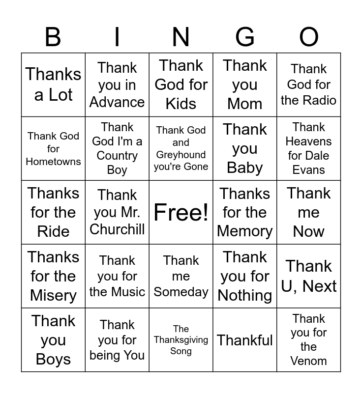 This bingo card has a free space and 24 words: Thank you for the Music, Thank you for being You, Thank God and Greyhound you're Gone, Thank you Boys, Thank God for the Radio, Thanks a Lot, Thank God for Hometowns, Thank you in Advance, Thanks for the Memory, Thank me Someday, Thank you Baby, Thanks for the Ride, Thank you for Nothing, Thank U, Next, Thank God I'm a Country Boy, Thankful, Thank me Now, Thank God for Kids, Thank Heavens for Dale Evans, Thank you Mr. Churchill, Thank you for the Venom, Thanks for the Misery, Thank you Mom and The Thanksgiving Song.