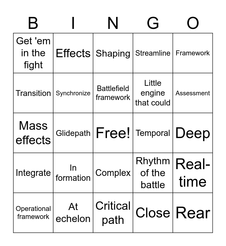 This bingo card has a free space and 24 words: In formation, At echelon, Battlefield framework, Operational framework, Framework, Get 'em in the fight, Transition, Effects, Temporal, Complex, Little engine that could, Mass effects, Rhythm of the battle, Real-time, Synchronize, Close, Deep, Shaping, Assessment, Glidepath, Rear, Integrate, Streamline and Critical path.
