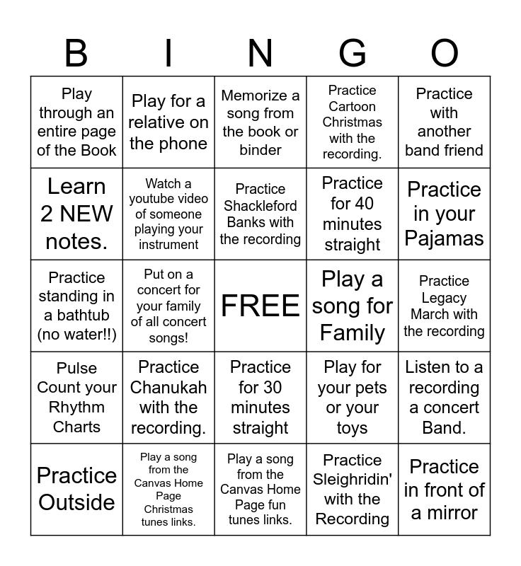 This bingo card has a free space and 24 words: Practice Chanukah with the recording., Play a song from the Canvas Home Page Christmas tunes links., Practice Shackleford Banks with the recording, Practice Outside, Practice with another band friend, Play through an entire page of the Book, Learn 2 NEW notes., Play for a relative on the phone, Play a song for Family, Practice for 30 minutes straight, Practice for 40 minutes straight, Practice standing in a bathtub (no water!!), Play for your pets or your toys, Listen to a recording a concert Band., Watch a youtube video of someone playing your instrument, Practice Sleighridin' with the Recording, Practice Legacy March with the recording, Memorize a song from the book or binder, Practice in your Pajamas, Put on a concert for your family of all concert songs!, Practice in front of a mirror, Pulse Count your Rhythm Charts, Practice Cartoon Christmas with the recording. and Play a song from the Canvas Home Page fun tunes links..