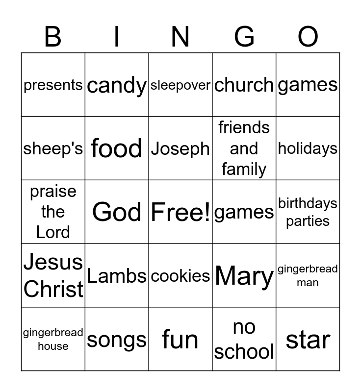 This bingo card has a free space and 24 words: Lambs, songs, Joseph, gingerbread house, games, presents, sheep's, candy, games, cookies, friends and family, praise the Lord, Mary, gingerbread man, food, no school, birthdays parties, sleepover, holidays, God, star, Jesus Christ, church and fun.