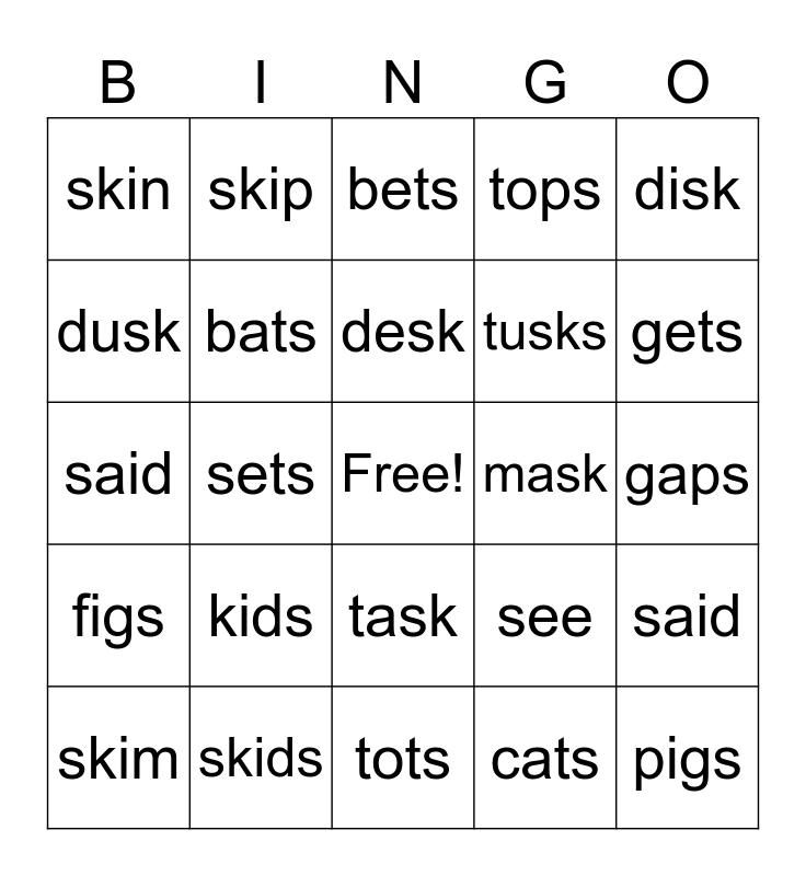 This bingo card has a free space and 24 words: kids, skids, desk, skim, disk, skin, dusk, skip, mask, task, tusks, said, see, said, bats, cats, gaps, bets, gets, sets, pigs, figs, tops and tots.