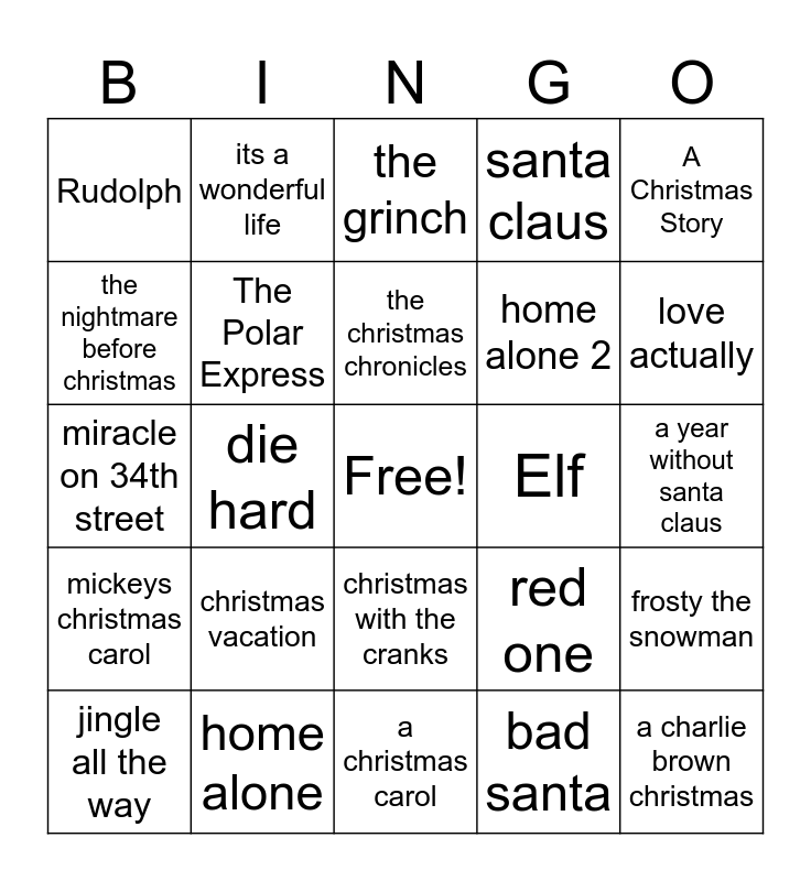 This bingo card has a free space and 24 words: christmas vacation, home alone, the christmas chronicles, jingle all the way, A Christmas Story, Rudolph, the nightmare before christmas, its a wonderful life, Elf, christmas with the cranks, home alone 2, miracle on 34th street, red one, frosty the snowman, The Polar Express, bad santa, a year without santa claus, the grinch, love actually, die hard, a charlie brown christmas, mickeys christmas carol, santa claus and a christmas carol.