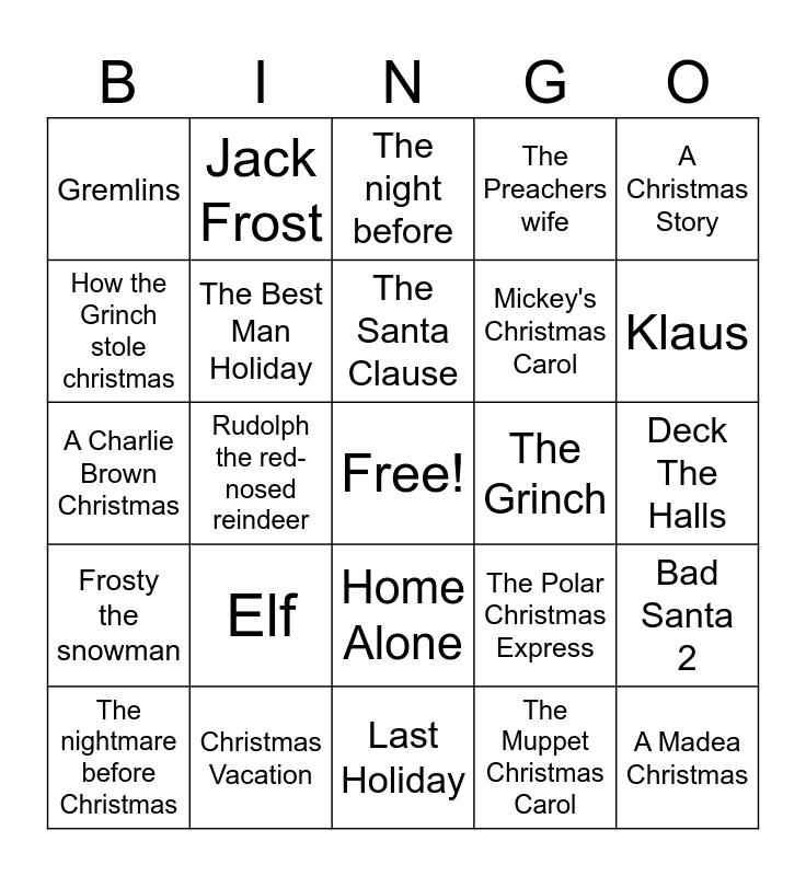 This bingo card has a free space and 24 words: Elf, Christmas Vacation, The Santa Clause, The nightmare before Christmas, A Christmas Story, Gremlins, How the Grinch stole christmas, Jack Frost, The Grinch, Home Alone, Mickey's Christmas Carol, A Charlie Brown Christmas, The Polar Christmas Express, Bad Santa 2, The Best Man Holiday, The Muppet Christmas Carol, Deck The Halls, The night before, Klaus, Rudolph the red-nosed reindeer, A Madea Christmas, Frosty the snowman, The Preachers wife and Last Holiday.
