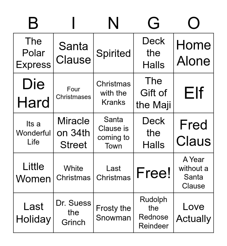 This bingo card has 25 words: White Christmas, Frosty the Snowman, Christmas with the Kranks, Last Holiday, Home Alone, The Polar Express, Die Hard, Santa Clause, Deck the Halls, Last Christmas, The Gift of the Maji, Its a Wonderful Life, Free!, A Year without a Santa Clause, Four Christmases, Love Actually, Fred Claus, Spirited, Elf, Miracle on 34th Street, Santa Clause is coming to Town, Dr. Suess the Grinch, Little Women, Deck the Halls and Rudolph the Rednose Reindeer.