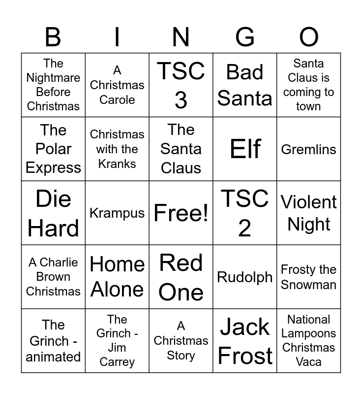This bingo card has a free space and 24 words: Home Alone, The Grinch -Jim Carrey, The Santa Claus, The Grinch - animated, Santa Claus is coming to town, The Nightmare Before Christmas, The Polar Express, A Christmas Carole, TSC 2, Red One, Elf, Die Hard, Rudolph, Frosty the Snowman, Christmas with the Kranks, Jack Frost, Violent Night, TSC 3, Gremlins, Krampus, National Lampoons Christmas Vaca, A Charlie Brown Christmas, Bad Santa and A Christmas Story.