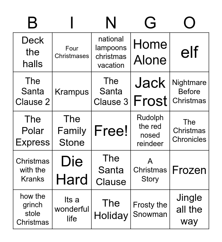 This bingo card has a free space and 24 words: Die Hard, Its a wonderful life, The Santa Clause 3, how the grinch stole Christmas, elf, Deck the halls, The Santa Clause 2, Four Christmases, Rudolph the red nosed reindeer, The Santa Clause, Jack Frost, The Polar Express, A Christmas Story, Frozen, Krampus, Frosty the Snowman, The Christmas Chronicles, national lampoons christmas vacation, Nightmare Before Christmas, The Family Stone, Jingle all the way, Christmas with the Kranks, Home Alone and The Holiday.