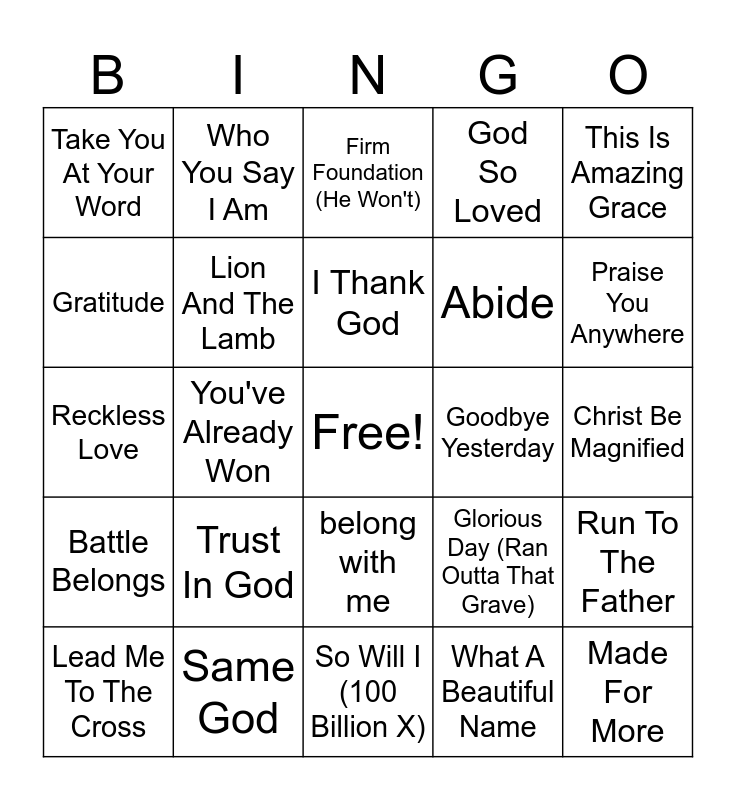 This bingo card has a free space and 36 words: I Know A Name, Praise, Graves Into Gardens, Lion And The Lamb, Glorious Day (Ran Outta That Grave), Battle Belongs, I Thank God, House Of The Lord, This Is Amazing Grace, This Is Our God, You've Already Won, God So Loved, Death Was Arrested, Goodbye Yesterday, Praise You Anywhere, Take You At Your Word, What a God, Trust In God, Made For More, Firm Foundation (He Won't), Christ Be Magnified, Run To The Father, Same God, Lead Me To The Cross, So Will I (100 Billion X), Who You Say I Am, Reckless Love, Who Else (Live), Abide, Gratitude, Great Are You Lord, O Praise The Name (Anástasis), What A Beautiful Name, belong with me, dont stop beleivong and africa.