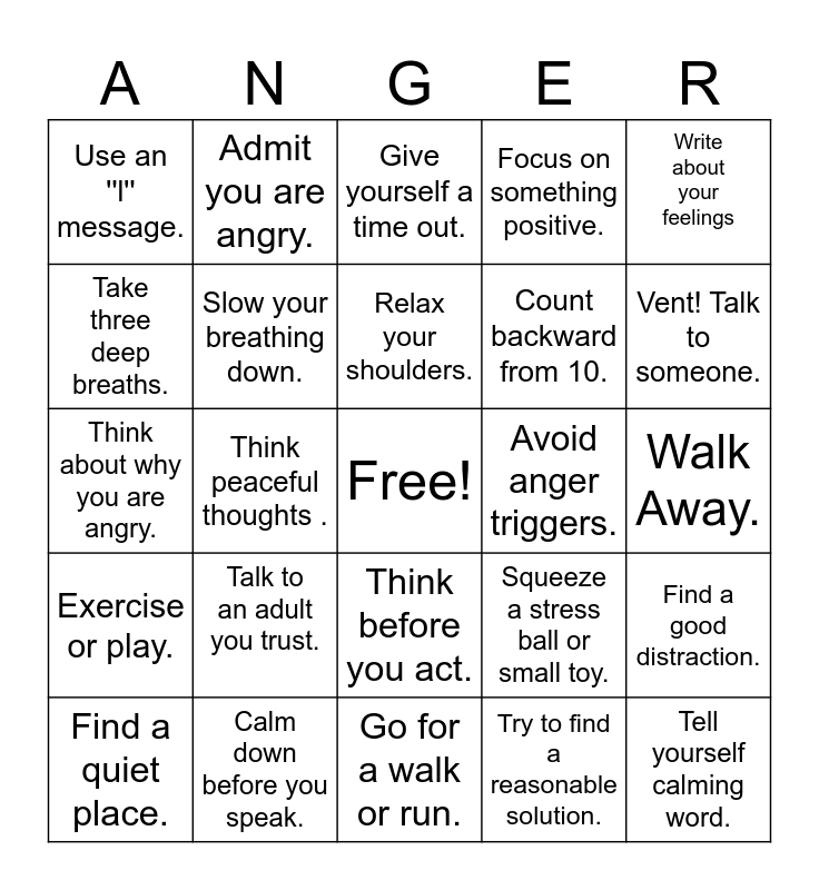 This bingo card has a free space and 24 words: Talk to an adult you trust., Calm down before you speak., Relax your shoulders., Find a quiet place., Write about your feelings, Use an ''l'' message., Take three deep breaths., Admit you are angry., Avoid anger triggers., Think before you act., Count backward from 10., Think about why you are angry., Squeeze a stress ball or small toy., Find a good distraction., Slow your breathing down., Try to find a reasonable solution., Walk Away., Give yourself a time out., Vent! Talk to someone., Think peaceful thoughts ., Tell yourself calming word., Exercise or play., Focus on something positive. and Go for a walk or run..