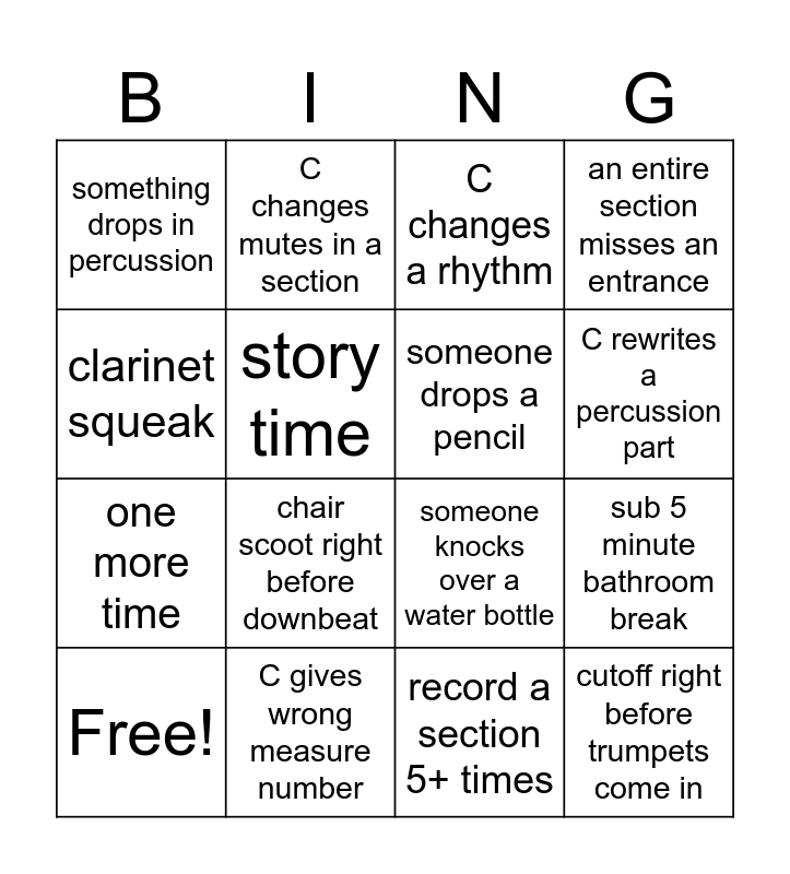 This bingo card has 23 words: cutoff right before trumpets come in, add articulation to a slur, C rewrites a percussion part, trumpets stand up, clarinet squeak, something drops in percussion, story time, C changes mutes in a section, Free!, someone plays way after cutoff, chair scoot right before downbeat, one more time, new version of euphonium concerto, mute drop, C gives wrong measure number, stand sinks down, C changes a rhythm, someone knocks over a water bottle, someone drops a pencil, sub 5 minute bathroom break, an entire section misses an entrance, record a section 5+ times and complete a full run of any piece.