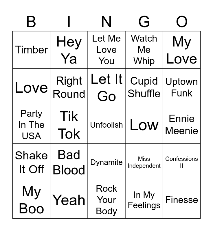 This bingo card has 60 words: Thousand Miles, Yeah, Locked Out Of Heaven, Shake It Off, In My Feelings, Good Life, Right Round, Baby, Cupid Shuffle, Teach Me How To Dougie, Watch Me Whip, Cha Cha Slide, Love, Levitating, No One, Timber, Unfoolish, My Love, 1,2 Step, Let It Go, Low, Let Me Love You, My Boo, Confessions II, I’m Sprung, One Time, Fein, P.Y.T., Uptown Funk, Return Of The Mack, One Last Time, Marry You, Single Ladies, Crazy In Love, Hey Ya, Hips Don’t Lie, Beautiful Things, Tik Tok, Die With A Smile, Party In The USA, It’s Tricky, Bad Blood, Ennie Meenie, Drive By, Miss Independent, I Got A Feeling, Beautiful Girls, Down, Candy Rain, Dynamite, Rock Your Body, Blinding Lights, Temperature, Cheap Thrills, Despacito Remix, Mi Gente, Let’s Go, Party Rock Anthem, Finesse and Me & You.