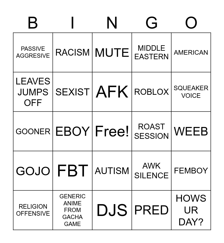 This bingo card has a free space and 24 words: FBT, GENERIC ANIME FROM GACHA GAME, AFK, RELIGION OFFENSIVE, AMERICAN, PASSIVE AGGRESIVE, LEAVES JUMPS OFF, RACISM, ROAST SESSION, AUTISM, ROBLOX, GOONER, AWK SILENCE, FEMBOY, SEXIST, PRED, WEEB, MUTE, SQUEAKER VOICE, EBOY, HOWS UR DAY?, GOJO, MIDDLE EASTERN and DJS.