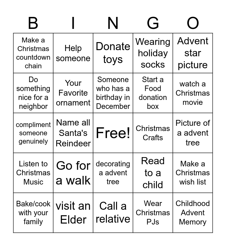 This bingo card has a free space and 24 words: Go for a walk, visit an Elder, Someone who has a birthday in December, Bake/cook with your family, Advent star picture, Make a Christmas countdown chain, Do something nice for a neighbor, Help someone, Christmas Crafts, decorating a advent tree, Start a Food donation box, compliment someone genuinely, Read to a child, Make a Christmas wish list, Your Favorite ornament, Wear Christmas PJs, Picture of a advent tree, Donate toys, watch a Christmas movie, Name all Santa's Reindeer, Childhood Advent Memory, Listen to Christmas Music, Wearing holiday socks and Call a relative.