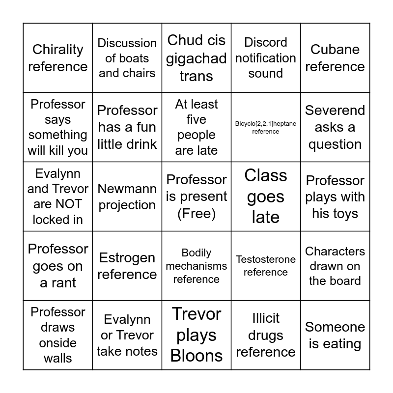 This bingo card has a free space and 24 words: Estrogen reference, Evalynn or Trevor take notes, At least five people are late, Professor draws onside walls, Cubane reference, Chirality reference, Professor says something will kill you, Discussion of boats and chairs, Class goes late, Bodily mechanisms reference, Bicyclo[2,2,1]heptane reference, Evalynn and Trevor are NOT locked in, Testosterone reference, Characters drawn on the board, Professor has a fun little drink, Illicit drugs reference, Professor plays with his toys, Chud cis gigachad trans, Severend asks a question, Newmann projection, Someone is eating, Professor goes on a rant, Discord notification sound and Trevor plays Bloons.
