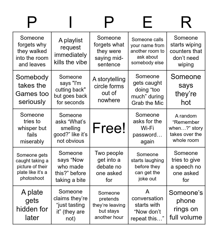 This bingo card has a free space and 24 words: Someone says “Now who made this?” before taking a bite, Someone claims they’re “just tasting it” (they are not), A storytelling circle forms out of nowhere, A plate gets hidden for later, Someone starts wiping counters that don’t need wiping, Someone forgets why they walked into the room and leaves, Somebody takes the Games too seriously, A playlist request immediately kills the vibe, Someone asks for the Wi-Fi password… again, Two people get into a debate no one asked for, Someone gets caught doing “too much” during Grab the Mic, Someone tries to whisper but fails miserably, Someone starts laughing before they can get the joke out, Someone tries to give a speech no one asked for, Someone says "I'm cutting back" but goes back for seconds, A conversation starts with “Now don’t repeat this…”, A random “Remember when…?” story takes over the whole room, Someone forgets what they were saying mid-sentence, Someone says they’re hot, Someone asks “What’s smelling good?” like it’s not obvious, Someone’s phone rings on full volume, Someone gets caught taking a picture of their plate like it’s a photoshoot, Someone calls your name from another room to ask about somebody else and Someone pretends they’re leaving but stays another hour.