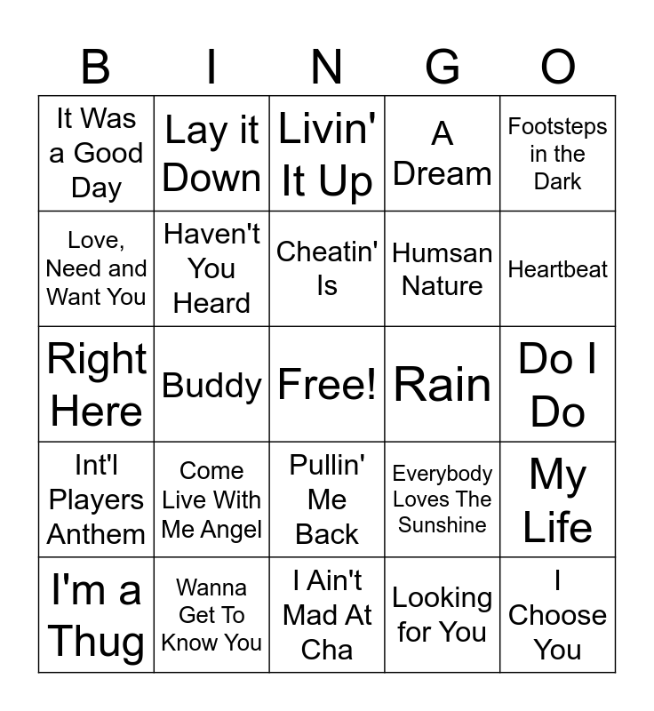 This bingo card has a free space and 24 words: Come Live With Me Angel, Wanna Get To Know You, Cheatin' Is, I'm a Thug, Footsteps in the Dark, It Was a Good Day, Love, Need and Want You, Lay it Down, Rain, Pullin' Me Back, Humsan Nature, Right Here, Everybody Loves The Sunshine, My Life, Haven't You Heard, Looking for You, Do I Do, Livin' It Up, Heartbeat, Buddy, I Choose You, Int'l Players Anthem, A Dream and I Ain't Mad At Cha.