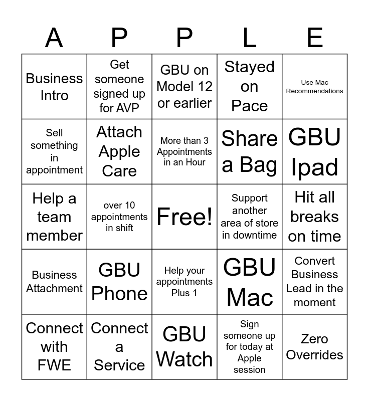 This bingo card has a free space and 24 words: GBU Phone, Connect a Service, More than 3 Appointments in an Hour, Connect with FWE, Use Mac Recommendations, Business Intro, Sell something in appointment, Get someone signed up for AVP, Support another area of store in downtime, Help your appointments Plus 1, Share a Bag, Help a team member, GBU Mac, Convert Business Lead in the moment, Attach Apple Care, Sign someone up for today at Apple session, Hit all breaks on time, GBU on Model 12 or earlier, GBU Ipad, over 10 appointments in shift, Zero Overrides, Business Attachment, Stayed on Pace and GBU Watch.