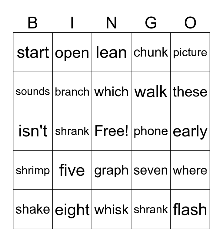 This bingo card has a free space and 24 words: five, eight, which, shake, picture, start, sounds, open, phone, graph, walk, isn't, seven, where, branch, shrank, early, lean, these, shrank, flash, shrimp, chunk and whisk.