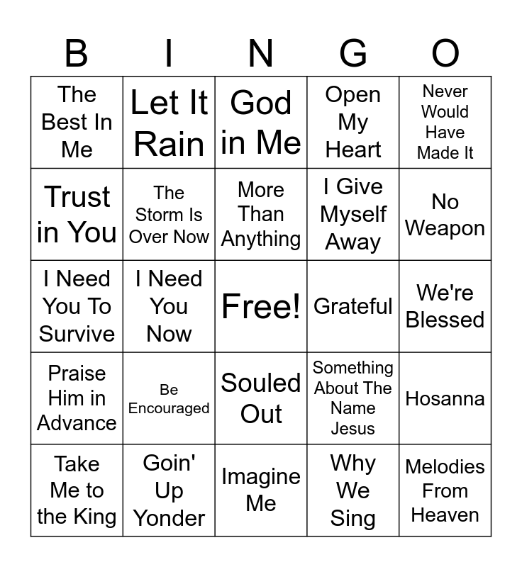 This bingo card has a free space and 24 words: Be Encouraged, Goin' Up Yonder, More Than Anything, Take Me to the King, Never Would Have Made It, The Best In Me, Trust in You, Let It Rain, Grateful, Souled Out, I Give Myself Away, I Need You To Survive, Something About The Name Jesus, Hosanna, The Storm Is Over Now, Why We Sing, We're Blessed, God in Me, No Weapon, I Need You Now, Melodies From Heaven, Praise Him in Advance, Open My Heart and Imagine Me.