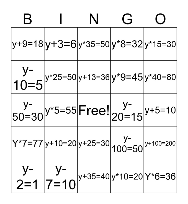This bingo card has a free space and 24 words: y+10=20, y-7=10, y+13=36, y-2=1, y*15=30, y+9=18, y-10=5, y+3=6, y-20=15, y+25=30, y*9=45, y-50=30, y-100=50, y+100=200, y*25=50, y*10=20, y+5=10, y*35=50, y*40=80, y*5=55, Y*6=36, Y*7=77, y*8=32 and y+35=40.