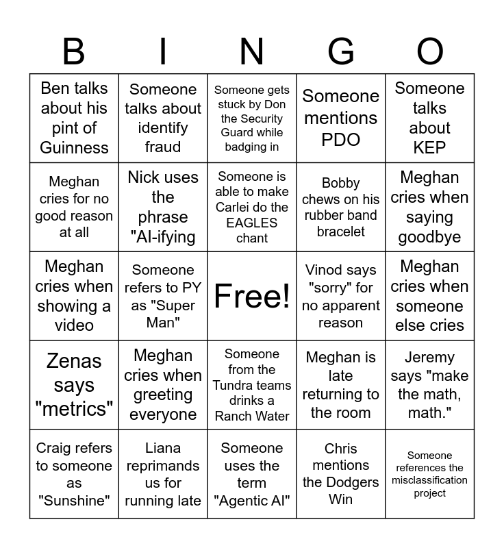 This bingo card has a free space and 24 words: Meghan cries when greeting everyone, Liana reprimands us for running late, Someone is able to make Carlei do the EAGLES chant, Craig refers to someone as "Sunshine", Someone talks about KEP, Ben talks about his pint of Guinness, Meghan cries for no good reason at all, Someone talks about identify fraud, Vinod says "sorry" for no apparent reason, Someone from the Tundra teams drinks a Ranch Water, Bobby chews on his rubber band bracelet, Meghan cries when showing a video, Meghan is late returning to the room, Jeremy says "make the math, math.", Nick uses the phrase "AI-ifying, Chris mentions the Dodgers Win, Meghan cries when someone else cries, Someone gets stuck by Don the Security Guard while badging in, Meghan cries when saying goodbye, Someone refers to PY as "Super Man", Someone references the misclassification project, Zenas says "metrics", Someone mentions PDO and Someone uses the term "Agentic AI".