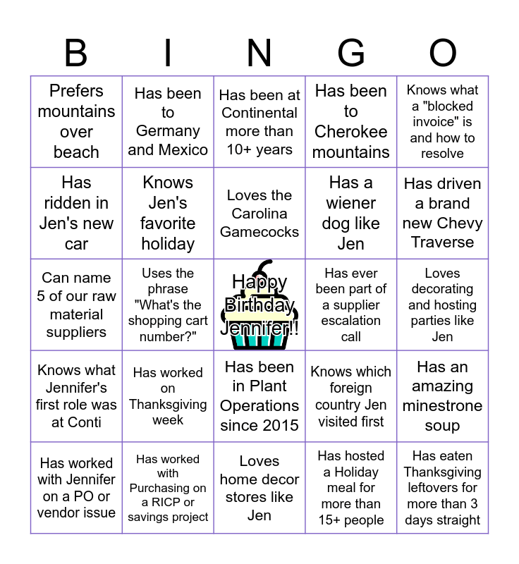 This bingo card has a free space and 29 words: Has worked with Jennifer on a PO or vendor issue, Has ever helped Purchasing track down a hot part, Uses the phrase "What's the shopping cart number?", Has been in all 3 warehouses: RMW, SPW, FGW, Prefers mountains over beach, Has been at Continental more than 10+ years, Knows Jen's favorite holiday, Has worked on Thanksgiving week, Has ever been part of a supplier escalation call, Has worked with Purchasing on a RICP or savings project, Loves decorating and hosting parties like Jen, Has eaten Thanksgiving leftovers for more than 3 days straight, Loves home decor stores like Jen, Has hosted a Holiday meal for more than 15+ people, Has driven a brand new Chevy Traverse, Knows when is Jen's birth date, Has been in Plant Operations since 2015, Knows what Jennifer's first role was at Conti, Knows what a "blocked invoice" is and how to resolve, Can name 5 of our raw material suppliers, Knows which foreign country Jen visited first, Has placed an emergency or rush order before, Has a wiener dog like Jen, Has ridden in Jen's new car, Has been to Cherokee mountains, Has been to Germany and Mexico, Has an amazing minestrone soup, Loves the Carolina Gamecocks and Favorite movie is Willie Wonka & Chocolate Factory.