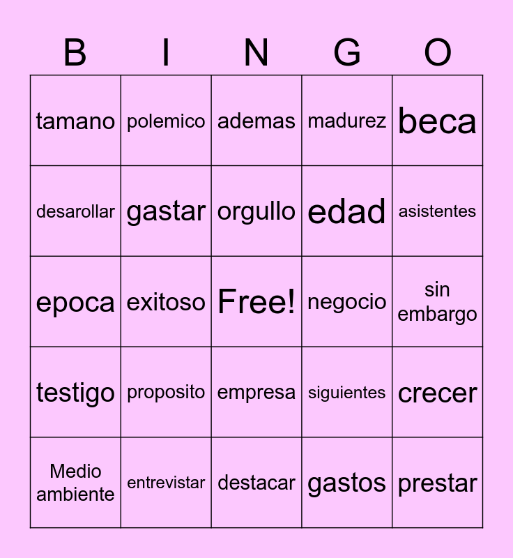 This bingo card has a free space and 24 words: proposito, entrevistar, orgullo, Medio ambiente, beca, tamano, desarollar, polemico, negocio, empresa, edad, epoca, siguientes, crecer, gastar, gastos, sin embargo, ademas, asistentes, exitoso, prestar, testigo, madurez and destacar.