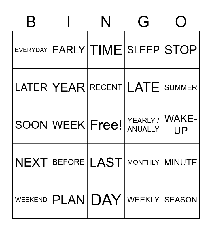 This bingo card has a free space and 31 words: DAY, MONTH, WEEK, TOMORROW, EVERYDAY, TIME, YEAR, MONTHLY, YEARLY / ANUALLY, WEEKLY, WAKE-UP, SEASON, FALL, SPRING, SUMMER, WINTER, MINUTE, BEFORE, NEXT, LAST, STOP, ALWAYS, WEEKEND, EARLY, LATE, LATER, SLEEP, SOON, PLAN, RECENT and HOUR.