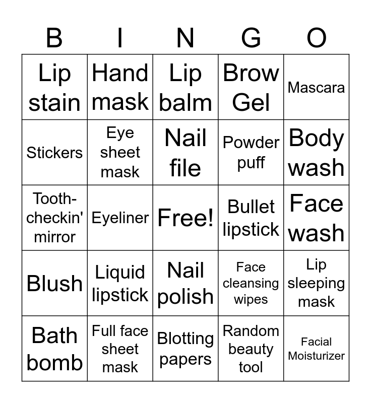 This bingo card has a free space and 41 words: Invisibobble, Tooth-checkin' mirror, Lip sheet mask, Eye sheet mask, Full face sheet mask, Nail polish, Nail file, Hair scrunchie, Mascara, Blush, Eyeliner, Brow Gel, Facial Moisturizer, Face wash, Bullet lipstick, Liquid lipstick, Lip gloss, Lip stain, Lip Oil, Lip balm, Lip sleeping mask, Pencil sharpener, Blotting papers, Powder puff, Pimple patches, Hair clips, Random beauty tool, Gua sha, Body wash, Lip liner, Bronzer, Hand mask, Bath bomb, Face roller, Face cleansing wipes, Stickers, Blackhead strip, Tweezers, Blending sponge, Eye cream and Hand cream.