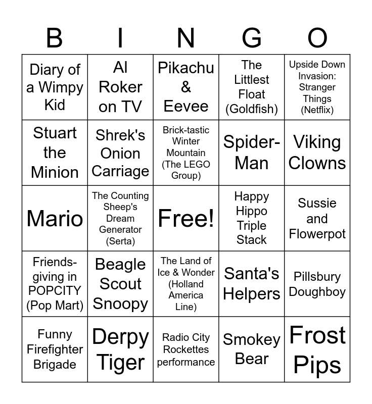 This bingo card has a free space and 40 words: Buzz Lightyear, Mario, PAC-MAN, Shrek's Onion Carriage, Derpy Tiger, The Land of Ice & Wonder (Holland America Line), Brick-tastic Winter Mountain (The LEGO Group), Master Chocolatier Ballroom (Lindt), Upside Down Invasion: Stranger Things (Netflix), Friends-giving in POPCITY (Pop Mart), The Counting Sheep's Dream Generator (Serta), The Littlest Float (Goldfish), Frost Pips, Sussie and Flowerpot, Happy Hippo Triple Stack, Beagle Scout Snoopy, Bluey, Diary of a Wimpy Kid, SpongeBob SquarePants & Gary, Pikachu & Eevee, Pillsbury Doughboy, Smokey Bear, Spider-Man, Stuart the Minion, Santa's Sleigh, Tom Turkey, 1-2-3 Sesame Street, Camp Snoopy, Pasta Knight, World of the Teenage Mutant Ninja Turtles, Alphabet Clowns, Funny Firefighter Brigade, Keystone Cops, Santa's Helpers, Viking Clowns, Radio City Rockettes performance, Broadway performance (e.g., Ragtime, Buena Vista Social Club), a marching band, Al Roker on TV and Santa Claus finale.