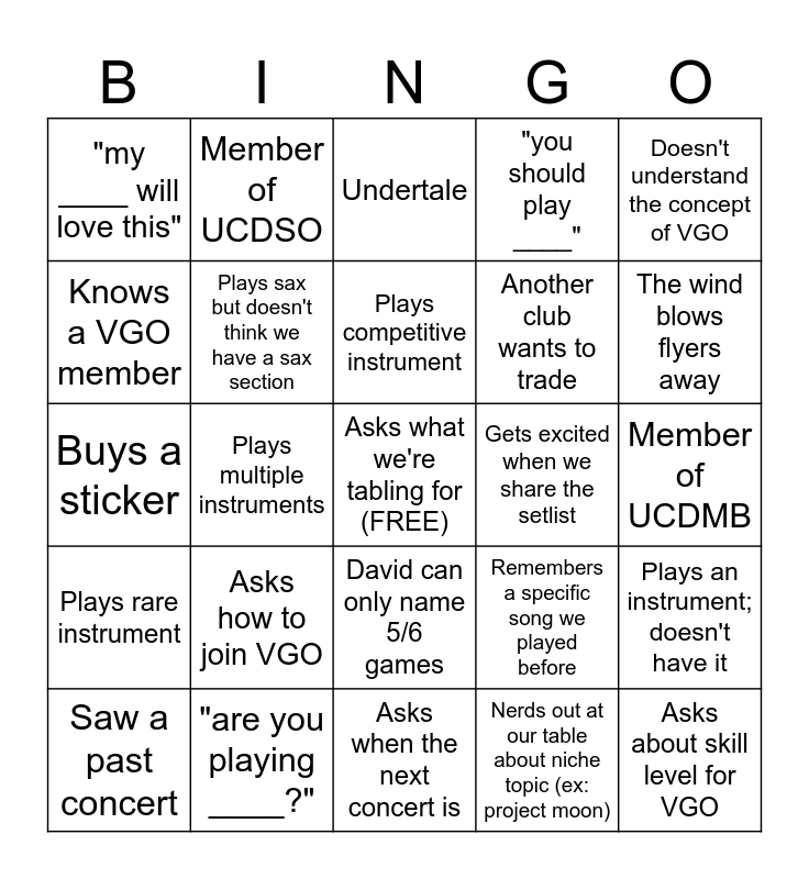 This bingo card has a free space and 24 words: Asks how to join VGO, "are you playing ____?", Plays competitive instrument, Saw a past concert, Doesn't understand the concept of VGO, "my ____ will love this", Knows a VGO member, Member of UCDSO, Gets excited when we share the setlist, David can only name 5/6 games, Another club wants to trade, Buys a sticker, Remembers a specific song we played before, Plays an instrument; doesn't have it, Plays sax but doesn't think we have a sax section, Nerds out at our table about niche topic (ex: project moon), Member of UCDMB, Undertale, The wind blows flyers away, Plays multiple instruments, Asks about skill level for VGO, Plays rare instrument, "you should play ____" and Asks when the next concert is.