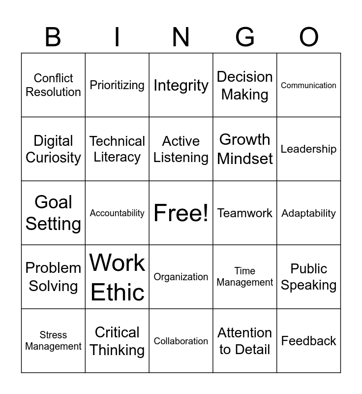 This bingo card has a free space and 28 words: Public Speaking, Cultural Awareness, Growth Mindset, Attention to Detail, Digital Curiosity, Integrity, Prioritizing, Problem Solving, Teamwork, Stress Management, Goal Setting, Decision Making, Critical Thinking, Collaboration, Leadership, Creativity, Work Ethic, Technical Literacy, Active Listening, Organization, Conflict Resolution, Empathy, Feedback, Accountability, Adaptability, Time Management, Communication and Teamwork.
