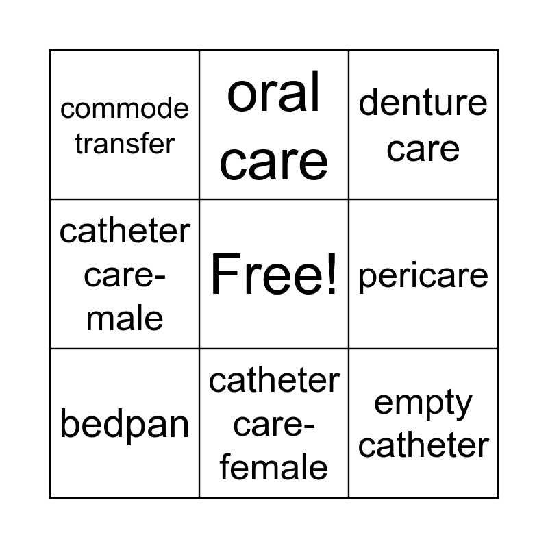 This bingo card has a free space and 8 words: pericare, denture care, oral care, bedpan, commode transfer, empty catheter, catheter care- male and catheter care- female.