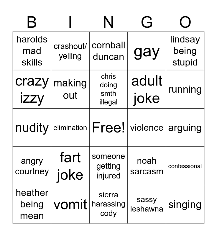 This bingo card has a free space and 24 words: fart joke, vomit, chris doing smth illegal, heather being mean, lindsay being stupid, harolds mad skills, crazy izzy, crashout/ yelling, violence, someone getting injured, adult joke, nudity, noah sarcasm, confessional, making out, sassy leshawna, arguing, cornball duncan, running, elimination, singing, angry courtney, gay and sierra harassing cody.