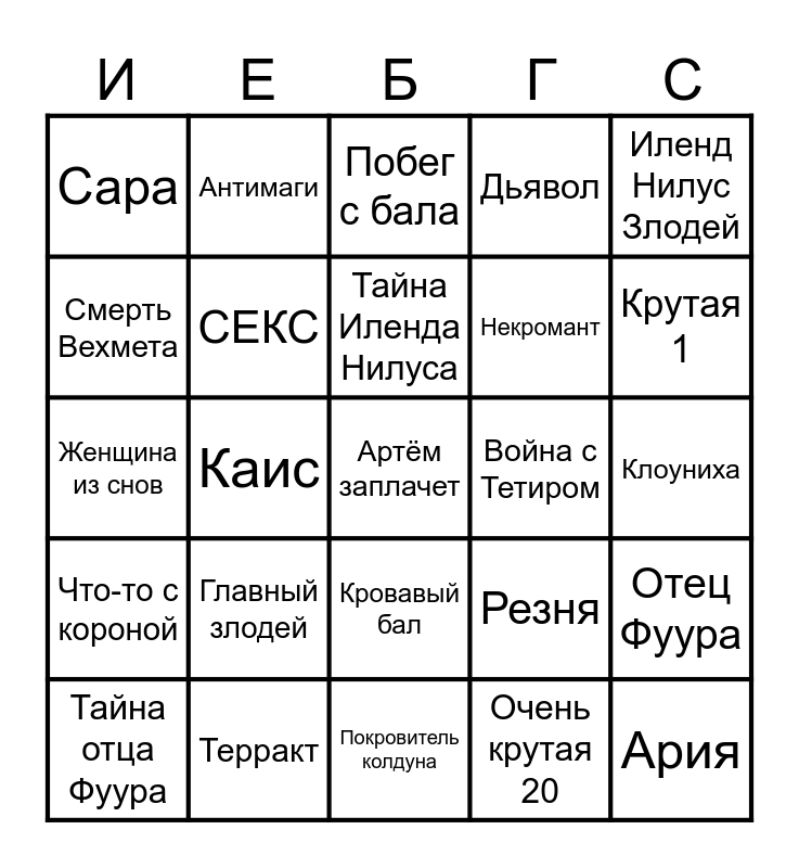 This bingo card has 25 words: Главный злодей, Покровитель колдуна, Тайна Иленда Нилуса, Тайна отца Фуура, Иленд Нилус Злодей, Сара, Смерть Вехмета, Антимаги, Война с Тетиром, Кровавый бал, Некромант, Женщина из снов, Резня, Отец Фуура, СЕКС, Ария, Клоуниха, Побег с бала, Крутая 1, Каис, Артём заплачет, Терракт, Что-то с короной, Дьявол and Очень крутая 20.