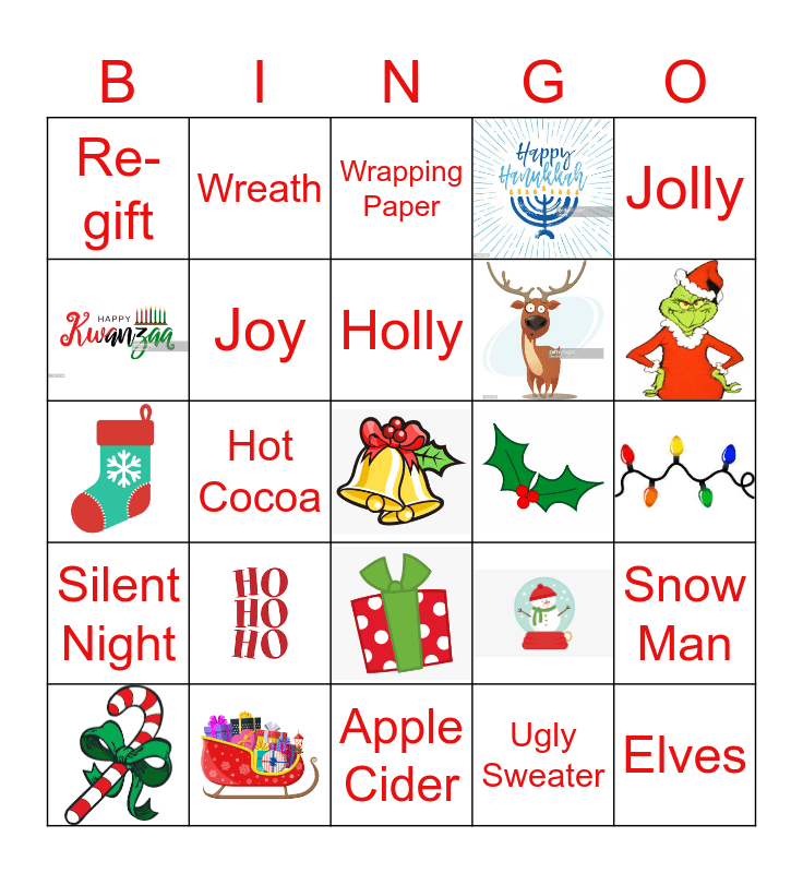 This bingo card has 17 images and 15 words: Ugly Sweater, Egg Nog, Hot Cocoa, Mistle Toe, Silent Night, Joy, Jolly, Snow Man, Wreath, Elves, Holly, Wrapping Paper, Apple Cider, Re-gift and Apple Cider.