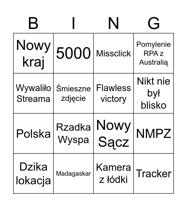 This bingo card has 16 words: Madagaskar, NMPZ, Missclick, Nowy kraj, Polska, 5000, Nowy Sącz, Kamera z łódki, Wywaliło Streama, Śmieszne zdjęcie, Dzika lokacja, Pomylenie RPA z Australią, Rzadka Wyspa, Nikt nie był blisko, Flawless victory and Tracker.