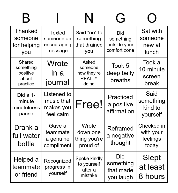 This bingo card has a free space and 24 words: Gave a teammate a genuine compliment, Recognized progress in yourself, Asked someone how they’re REALLY doing, Helped a teammate or friend, Sat with someone new at lunch, Thanked someone for helping you, Shared something positive about practice, Texted someone an encouraging message, Practiced a positive affirmation, Wrote down one thing you’re proud of, Took 5 deep belly breaths, Did a 1-minute mindfulness pause, Reframed a negative thought, Checked in with your feelings today, Wrote in a journal, Did something that made you laugh, Said something kind to yourself, Said “no” to something that drained you, Took a 10-minute screen break, Listened to music that makes you feel calm, Slept at least 8 hours, Drank a full water bottle, Did something outside your comfort zone and Spoke kindly to yourself after a mistake.