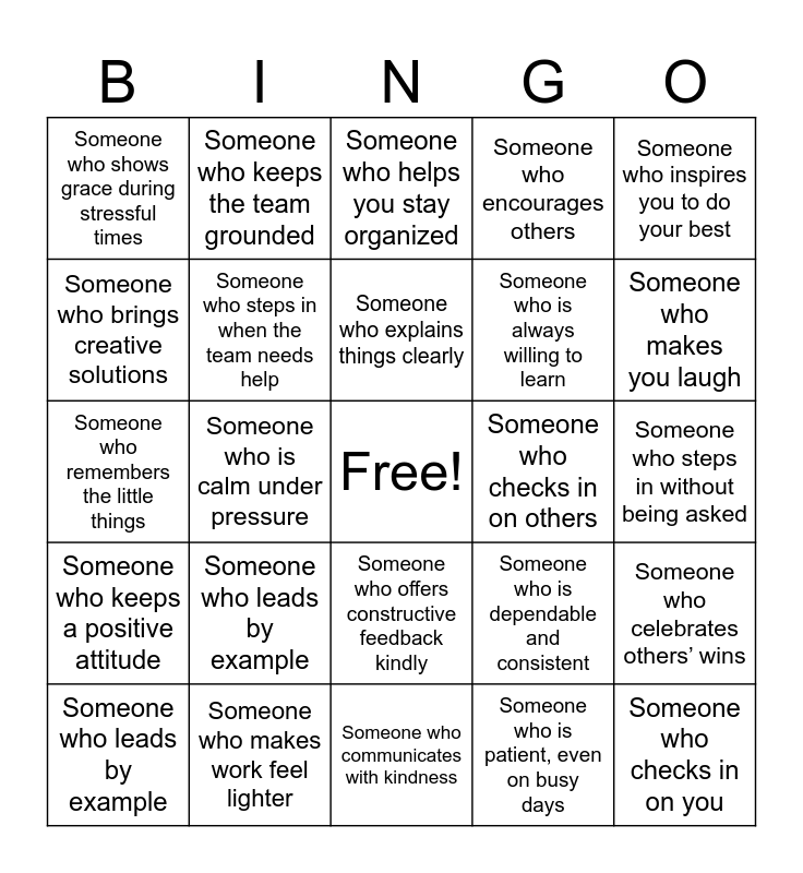 This bingo card has a free space and 42 words: Someone who always brings positive energy, Someone who explains things clearly, Someone who makes you feel supported, Someone who leads by example, Someone who is patient, even on busy days, Someone who celebrates others’ wins, Someone who checks in on you, Someone who makes meetings more enjoyable, Someone who helps you stay organized, Someone who offers constructive feedback kindly, Someone who steps in without being asked, Someone who makes you laugh, Someone who is calm under pressure, Someone who inspires you to do your best, Someone who shares good ideas, Someone who is dependable and consistent, Someone who advocates for students when no one is looking, Someone who remembers the little things, Someone who sends encouraging messages, Someone who keeps the team grounded, Someone who brings creative solutions, Someone who makes new staff feel welcome, Someone who works behind the scenes and never complains, Someone who shows grace during stressful times, Someone who lifts others up with their words, Someone who communicates clearly and respectfully, Someone who is always willing to learn, Someone who takes initiative, Someone who follows through on commitments, Someone who models strong work ethic, Someone who makes you feel supported, Someone who keeps a positive attitude, Someone who steps in when the team needs help, Someone who communicates with kindness, Someone who brings creative ideas, Someone who leads by example, Someone who makes work feel lighter, Someone who checks in on others, Someone who advocates for students, Someone who follows through on commitments, Someone who encourages others and Someone who shows grace under pressure.