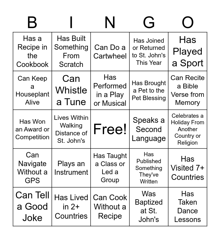 This bingo card has a free space and 24 words: Plays an Instrument, Has Lived in 2+ Countries, Has Performed in a Play or Musical, Can Tell a Good Joke, Has Played a Sport, Has a Recipe in the Cookbook, Can Keep a Houseplant Alive, Has Built Something From Scratch, Speaks a Second Language, Has Taught a Class or Led a Group, Has Brought a Pet to the Pet Blessing, Has Won an Award or Competition, Has Published Something They've Written, Has Visited 7+ Countries, Can Whistle a Tune, Was Baptized at St. John's, Celebrates a Holiday From Another Country or Religion, Can Do a Cartwheel, Can Recite a Bible Verse from Memory, Lives Within Walking Distance of St. John's, Has Taken Dance Lessons, Can Navigate Without a GPS, Has Joined or Returned to St. John's This Year and Can Cook Without a Recipe.