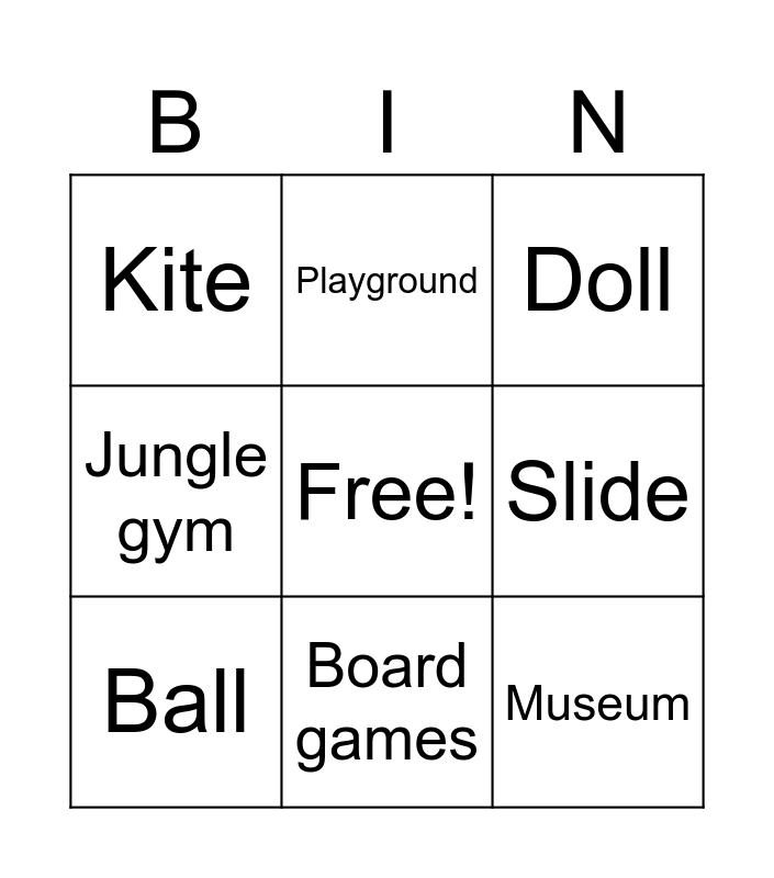 This bingo card has a free space and 8 words: Slide, Doll, Playground, Ball, Kite, Museum, Jungle gym and Board games.