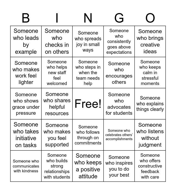 This bingo card has a free space and 25 words: Someone who makes you feel supported, Someone who keeps a positive attitude, Someone who steps in when the team needs help, Someone who communicates with kindness, Someone who brings creative ideas, Someone who leads by example, Someone who makes work feel lighter, Someone who checks in on others, Someone who advocates for students, Someone who follows through on commitments, Someone who encourages others, Someone who shows grace under pressure, Someone who celebrates others’ accomplishments, Someone who listens without judgment, Someone who helps new staff feel welcomed, Someone who is dependable when things get busy, Someone who explains things clearly, Someone who spreads joy in small ways, Someone who keeps calm in stressful moments, Someone who shares helpful resources, Someone who offers constructive feedback with care, Someone who builds strong relationships with students, Someone who takes initiative on tasks, Someone who consistently goes above expectations and Someone who inspires you to do your best.