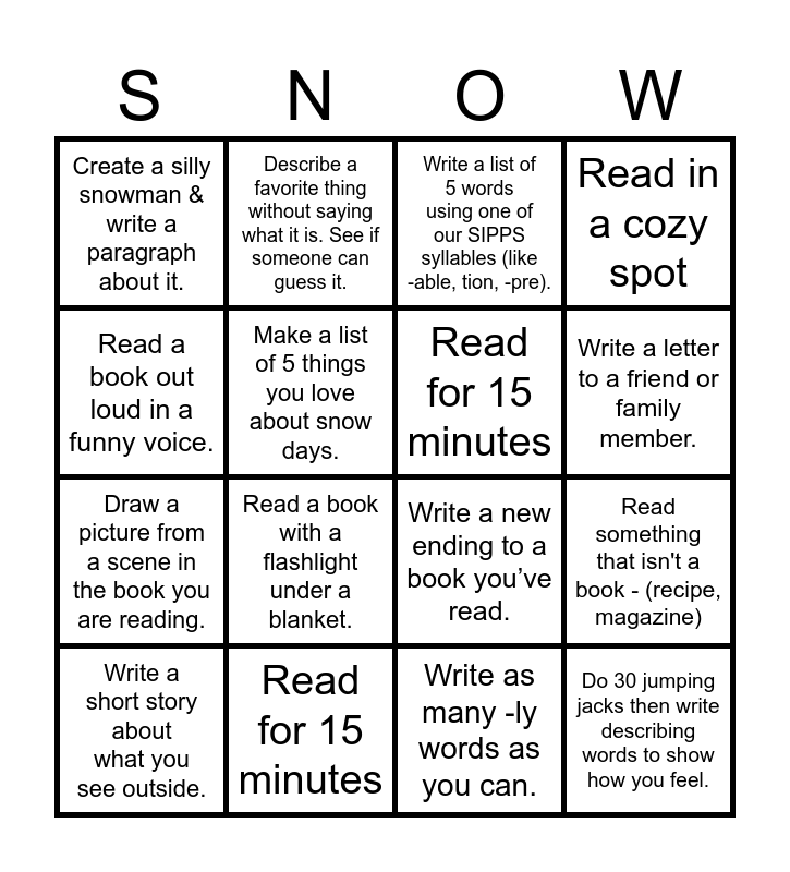 This bingo card has 16 words: Read for 15 minutes, Read something that isn't a book - (recipe, magazine), Write a list of 5 words using one of our SIPPS syllables (like -able, tion, -pre)., Create a silly snowman & write a paragraph about it., Draw a picture from a scene in the book you are reading., Describe a favorite thing without saying what it is. See if someone can guess it., Write a new ending to a book you’ve read., Write as many -ly words as you can., Read a book out loud in a funny voice., Make a list of 5 things you love about snow days., Write a short story about what you see outside., Read in a cozy spot, Read a book with a flashlight under a blanket., Write a letter to a friend or family member., Read for 15 minutes and Do 30 jumping jacks then write describing words to show how you feel..